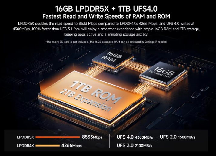 ▼加えてメモリ(RAM)も16GBでLPDDR5xを、内蔵ストレージ(保存容量)は1TBでUFS4.0と、動作も容量も素晴らしく高い。全部がすごすぎる。 ↓