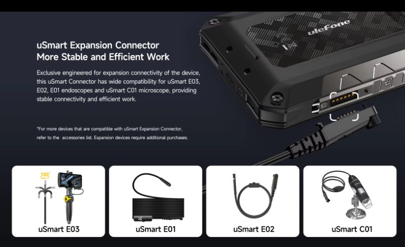 タフネススマホ特有ポイントとして、特殊端子のuSmartを備えております。こちらは外部ツールをくっつけるためのもので、別売りで内視鏡みたいなカメラとかマイクとかジンバルとか、それらを使うためのやつ。