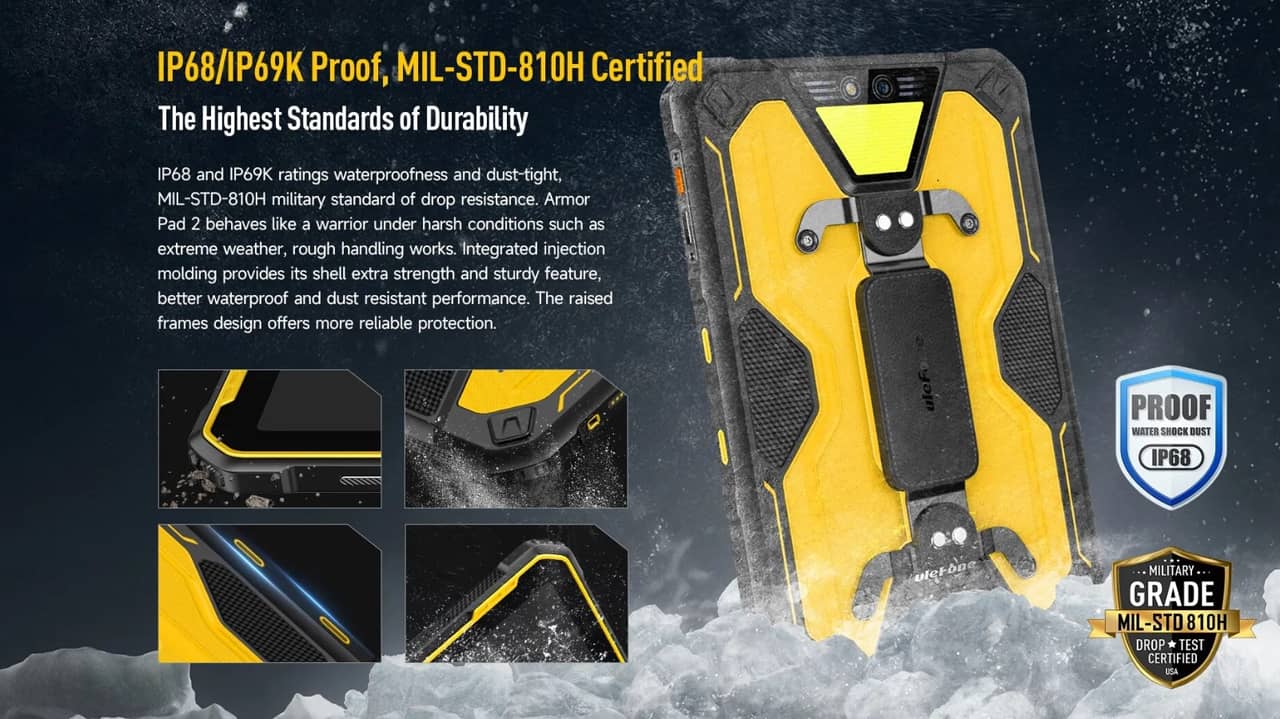 ▼Ulefone Armor Pad 2は見た目めっちゃ強そうですが実際に衝撃、水濡れに非常に強く頑丈!MIL-STD-810H等級およびIP69Kの防水防塵も持ち合わせています。↓