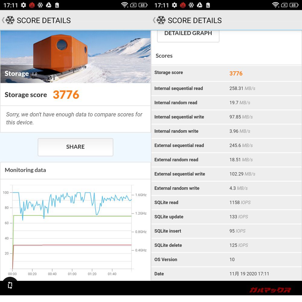 ▼ストレージ速度は書き込みが97.85MB/s、読み込みが258.31MB/sで値段なりの速度だった。↓