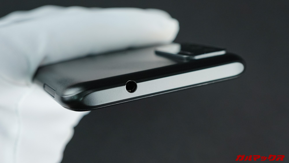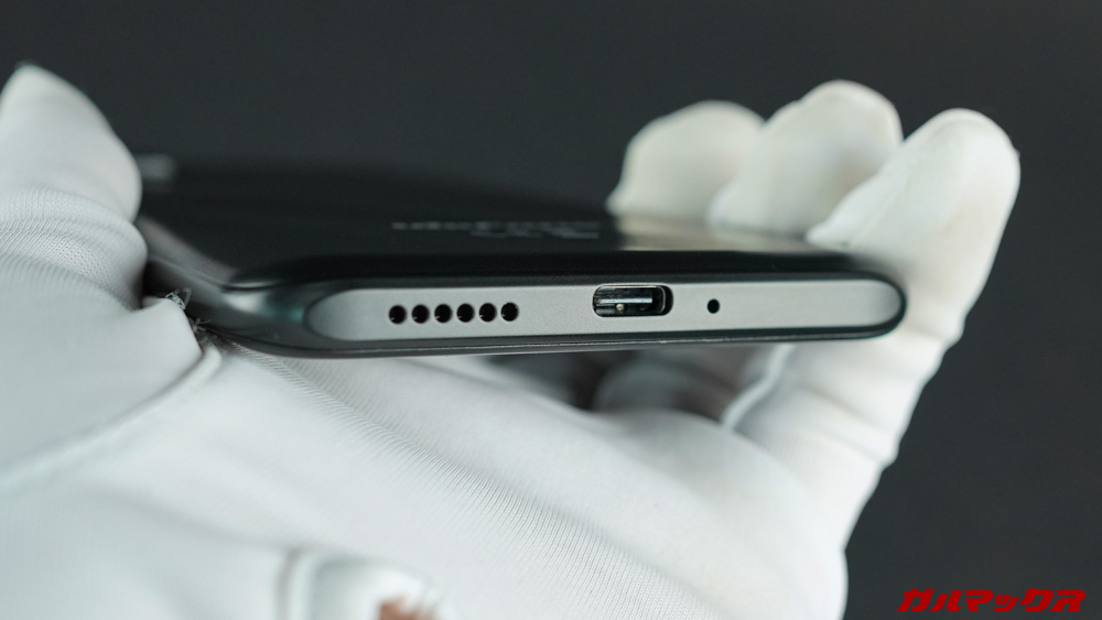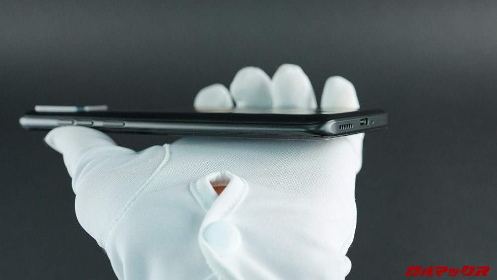 ▼ボタンの配置はオーソドックスで、右側面に電源と音量ボタン、上部にイヤホンジャック、下部にスピーカーとUSB-Cポートを搭載してます。↓