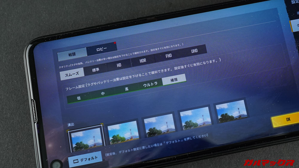 ゲーム性能はAnTuTuスコアが示す通りザ・ミドルレンジという感じなのですが、PUBGモバイルのグラフィック設定はハイエンドモデル向けのスムーズ+極限設定も可能でした。