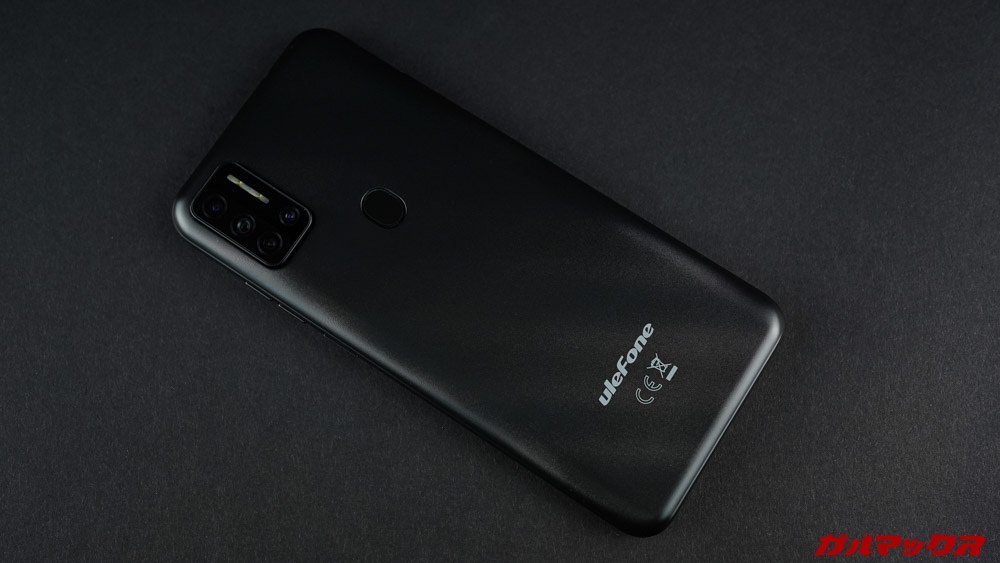 背面はザラザラとしたさわり心地。黒色でも指紋の付着は目立ちづらいですね。背面の素材は樹脂製で値段相応といった印象の質感。かなり分厚く重量も重いです。