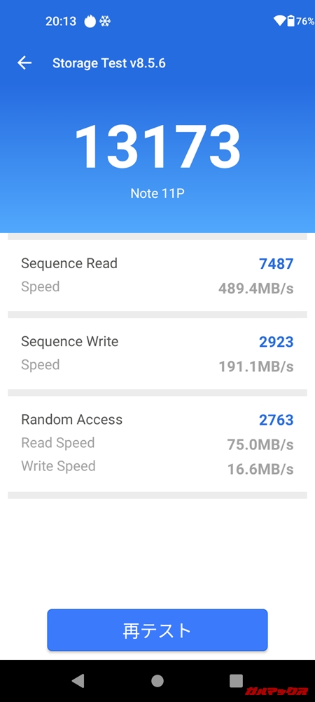 ▼ストレージ速度は読み込みが489.4MB/s、書き込みが191.1MB/s。書き込み速度はまずまずの結果で普段使いでは特に問題なし。↓