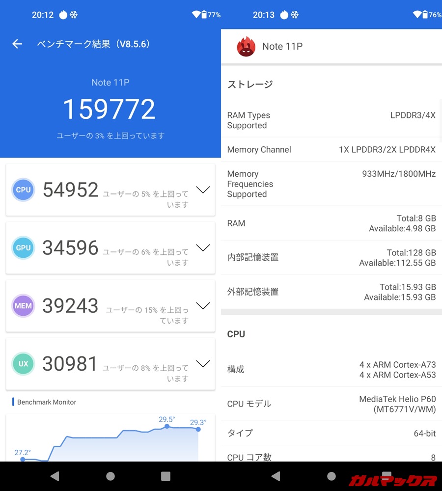 ▼Ulefone Note 11Pの実機でAnTuTu(Ver8)を測定しました!総合スコアは159,772、GPUスコアは34,596点です!↓