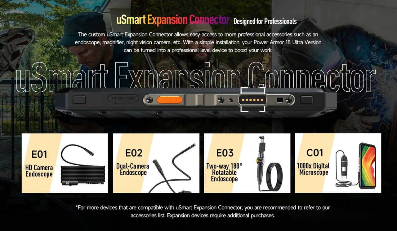 ▼またuSmartコネクタ対応。マイクロスコープや内視鏡といった特殊な作業カメラを接続してUlefone Power Armor 18 Ultra上で確認できるのも特色です。↓