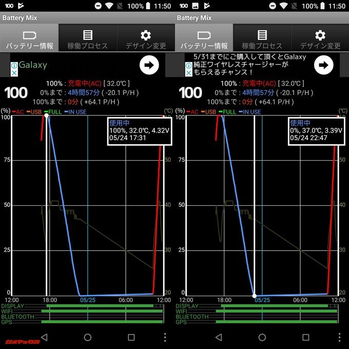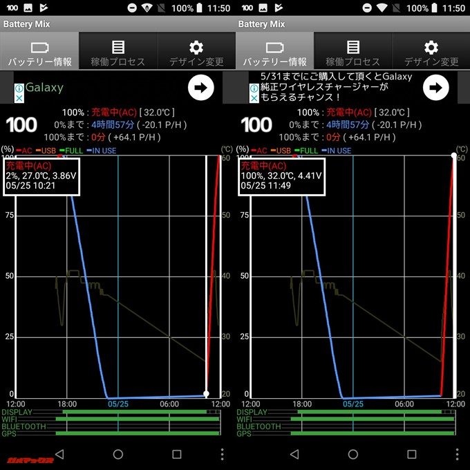 バッテリー持ちの検証は画面輝度を中間設定、自動輝度調整オフにてYouTubeの長時間動画を満充電からバッテリー切れまでBattery Mixアプリでデータ収集しています。