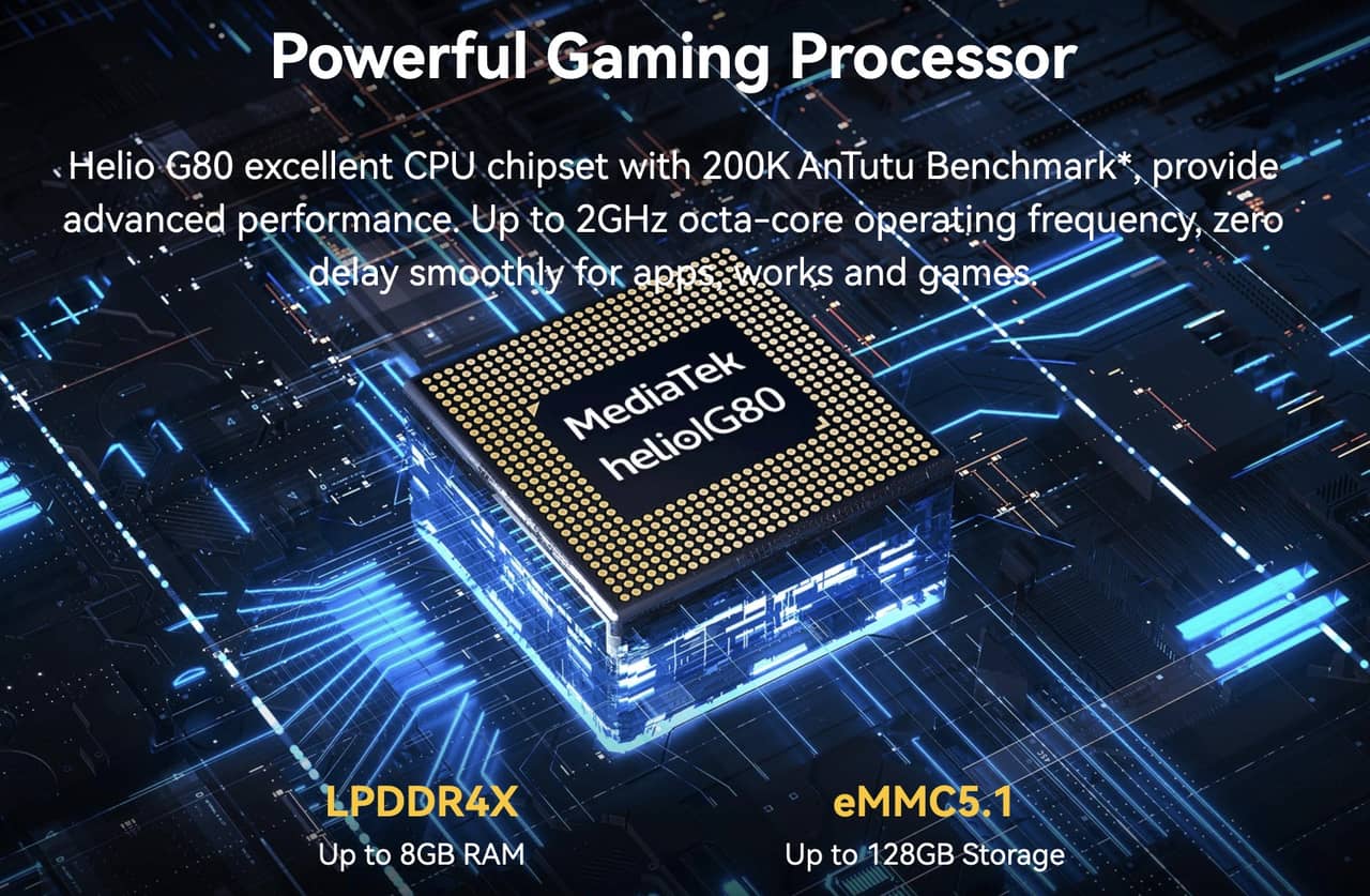 ▼処理性能やサクサク感に関わるSoCは「MediaTek Helio G80」を採用。↓