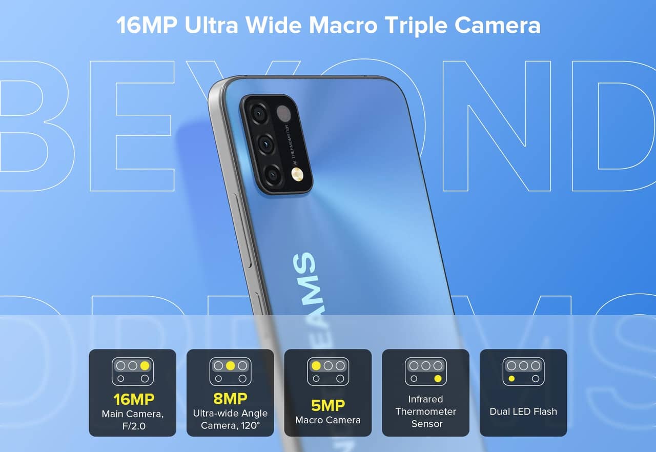 UMIDIGIが新スマホUMIDIGI A11を発表!赤外線体温測定に対応したトリプルカメラ、5,150mAhの大容量バッテリーを搭載!フラット形状の側面デザインが目を引くエントリーモデルです!発売日は5月頃!