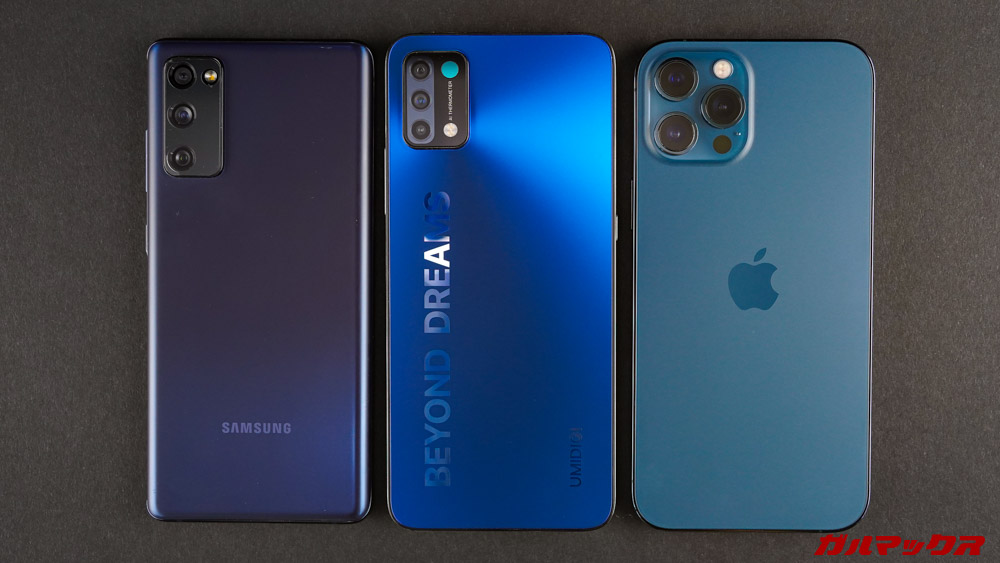 カメラの面積が結構小さい!相対的に本体がデカく見えます。筆者の持ってるGalaxy S20 FEと、編集長のiPhone 12 Pro Maxとで並べて比べてみたんですが、特にGalaxy S20 FEと大きさに差を感じます。↓