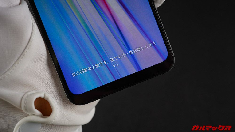 表記にもバグがあり、認識されなかった際にも「試行回数の上限」って出てくる。このときでも指紋認証ができる。赤い字で表示された場合は認証不可になってしまう