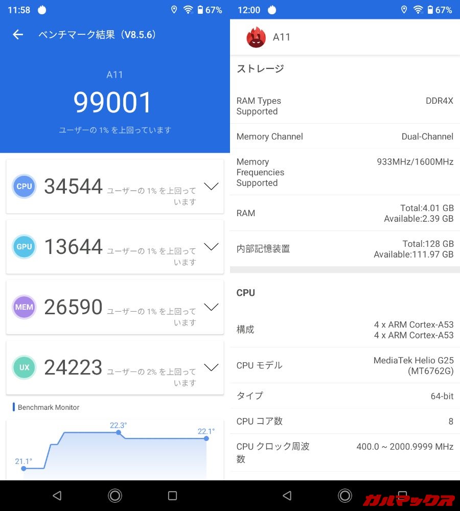 UMIDIGI A11のSoCはMediaTek Helio G25です。端末の処理性能を数値化するベンチマークをチェックしてみましょう。