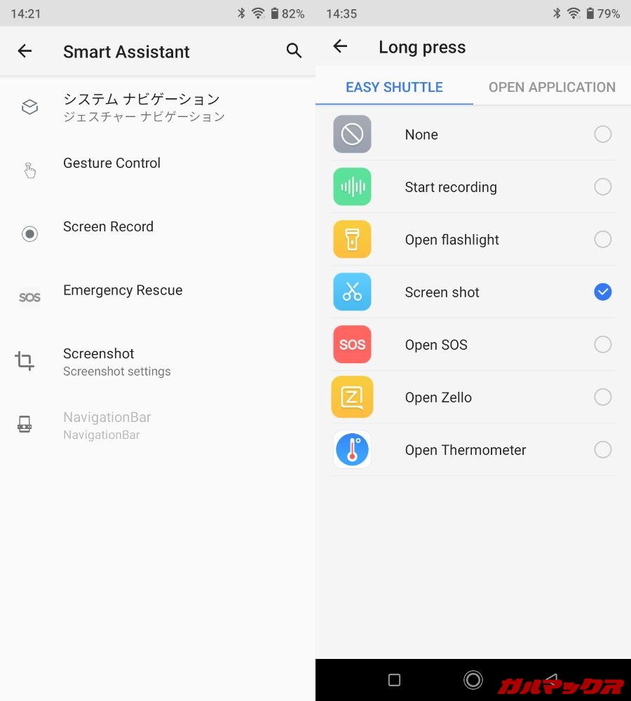 ▼設定項目にスクショ音のオンオフ項目はあるんですが、これは「UMIDIGI独自のトリミングスクショ」にしか適用されないので、通常のスクショ音は消せません。しかもトリミングスクショは通知バーの中のメニューからしか使えないので不便。↓