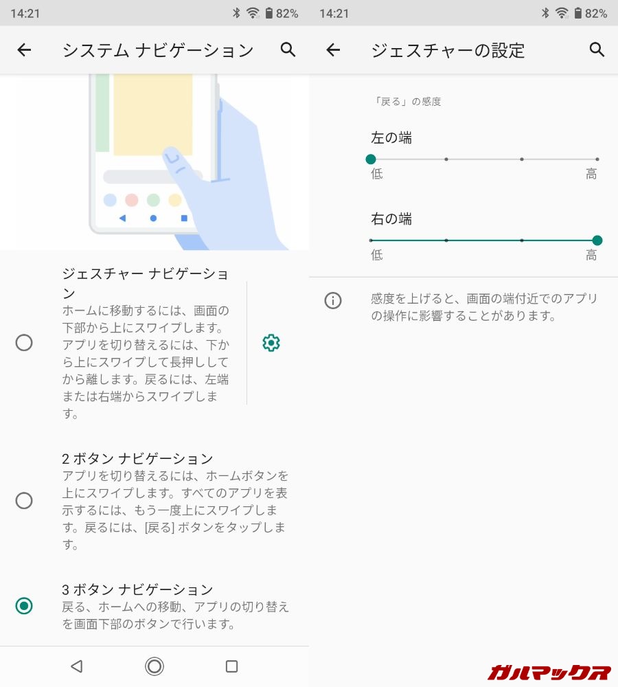 ナビゲーションバーのタイプやジェスチャー感度の設定が可能