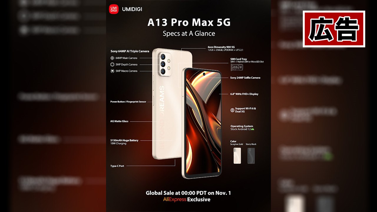 「UMIDIGI A13 Pro Max 5G」発表!メモリも容量も激盛りなミドルハイスマホ!