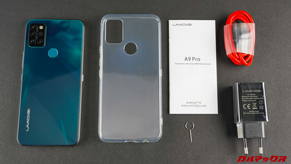 最近ではコスト削減の観点から充電器同梱を廃止するモデルも見受けられますが、UMIDIGI A9 Proは今でも同梱しており評価点。海外プラグ形状だったけど。