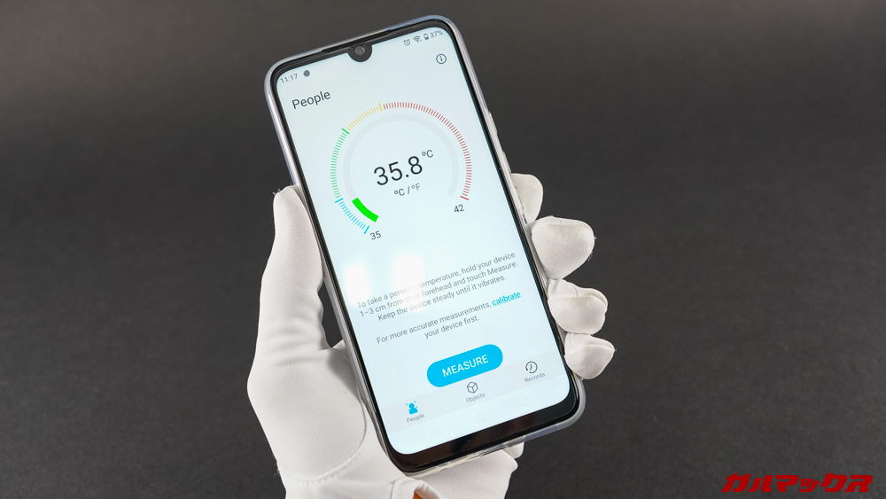 ▼一応「非接触」ではあるものの、対象に1センチぐらいまで近づく必要はあります。「Thermometer」アプリを開き、「MEASURE(測定)」をすれば1秒ほどですぐ結果が出てきます。↓