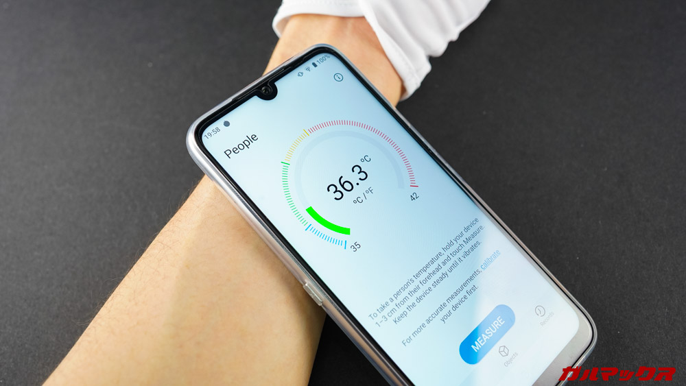 UMIDIGI A9 Proは赤外線体温計機能をドドンと搭載。非接触で温度を計測できるという他スマホでは見かけない変態的機能っす。人体だけでなく物体の温度も測ることが出来ますゾ。