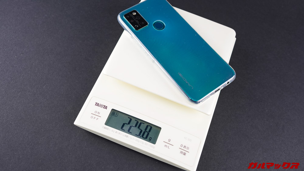 ▼このUMIDIGI A9 Pro、結構重いなぁって印象っす。持つたびそう思う。そう思って測ってみたら、ケース込みで225gとヘヴィ級でした(´・ω・`)。↓