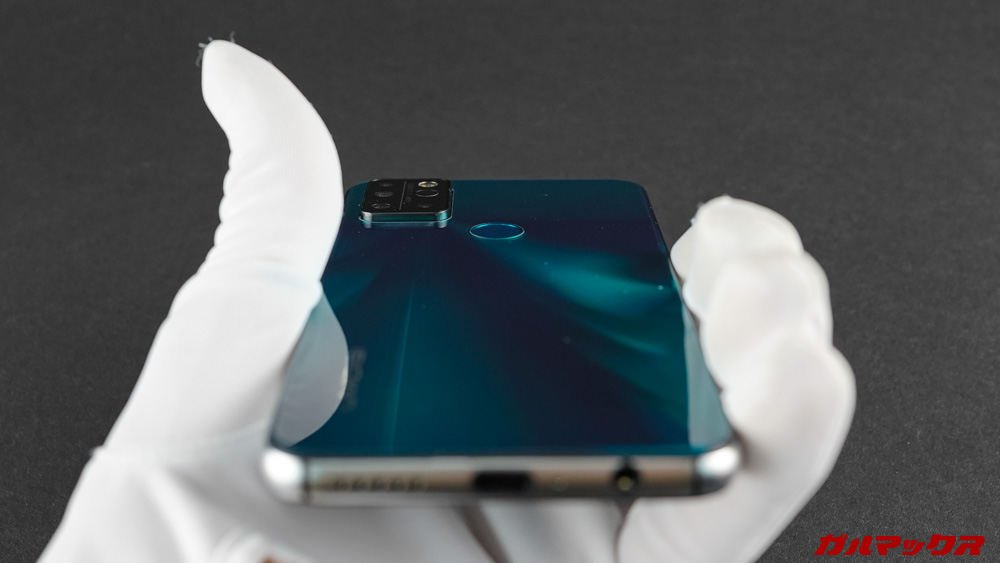 ▼背面が結構キレイ。反射させると結構美しくて驚きました!一時期のHUAWEIスマホみたいな美しさで高評価。指紋は付きやすいのはネックですが、この手の外観のスマホではよくあることなんで、ノーカウント(`・ω・´)。↓