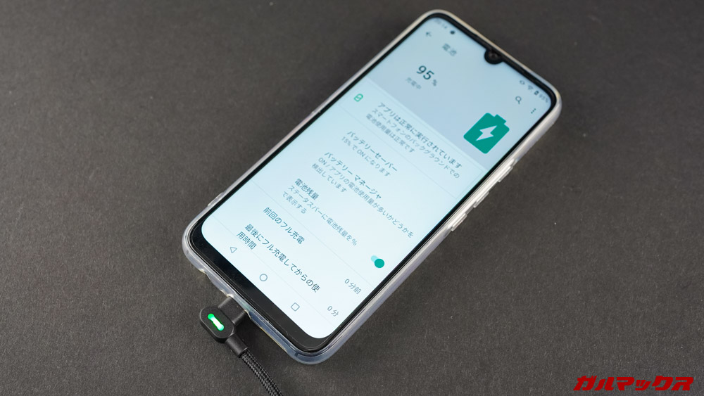 充電規格も10Wと並クラス。遅くはないですが早くもないって印象です。充電速度は1分に1パーセント回復するペースです(同梱充電器で充電して10分測ったら、50%→60%になってた)。