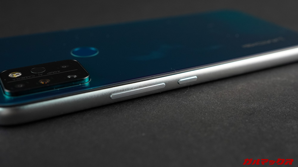 ▼側面デザインはいつものUMIDIGIクオリティですが、ボタンのクリック感はしっかりしてますし、端子周りもしっかり黒フチで保護されているので品質に関してはGood。チープなのは見た目だけ。↓