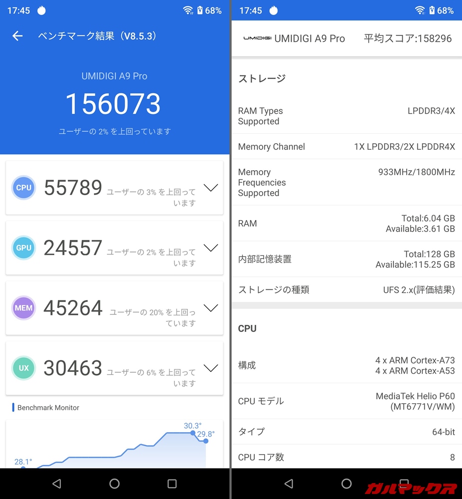 ▼UMIDIGI A9 Proの実機でAnTuTu(Ver8)を測定しました!総合スコアは156,073点、GPUスコアは24,557点です!↓