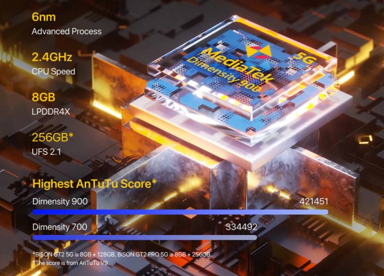 ▼BISON GT2 5G / GT2 Pro 5Gは5G対応SoCのDimensity 900を採用しているモデルとなります!公式が提示したAnTuTuスコアは421,541点と高水準!普段使いはもちろん、ゲームは画質設定を落とせば重いものでも遊べそうでワクワクするっすね(`・ω・´)。↓