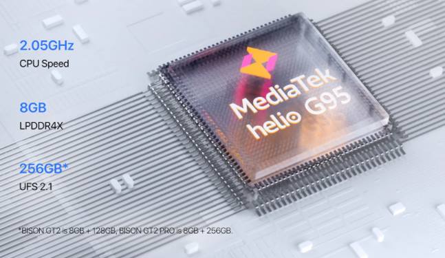 ▼BISON GT2とGT2 ProのSoCはMediaTek Helio G95を搭載しています!スペック的にはミドルレンジクラスで普段使いに困らない動作に期待できます。保存容量(ROM)は128GBで、上位版となるBISON GT2 Proは256GBに増量しています。↓