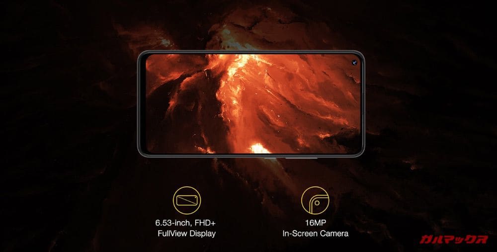 UMIDIGI Power 3のディスプレイサイズは大画面の6.53インチ!パンチホールのセルフィーカメラ(16MP)を搭載し、FHD+画質(1,080 × 2,340)に対応しています。