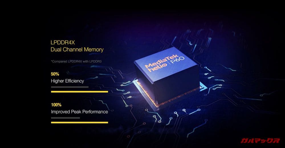 CPU:MediaTek、Helio P60、4xCortex-A73、2.0GHzおよび4xCortex-A53、最大2.0GHz
