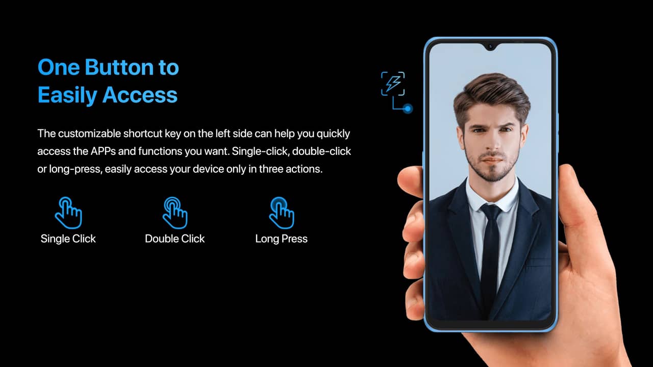 ▼また普通のスマホにはなかなか見られないマルチファンクションキーも搭載しています!これを押すことで任意のアプリを即起動できるようになっています!決済アプリやカメラなどよく使うものにしておけばサクッと起動できて便利。↓