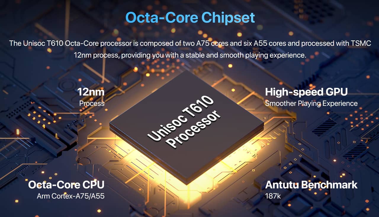 ▼SoCはUNISOCのT610を採用!AnTuTuスコアも18万点ほどのエントリークラスの性能なんですが保存容量(ROM)は128GBと大容量で、MicroSDカードも使えるためデータをたっぷり詰め込めるのは魅力!↓