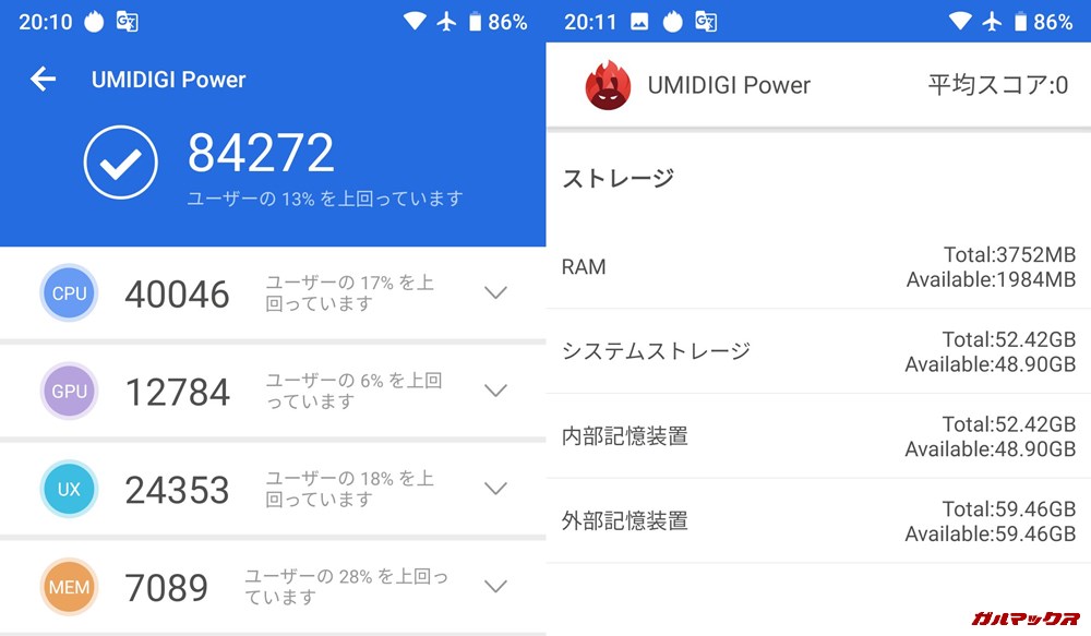 ▼名古屋の白くま様!UMIDIGI Powerの実機AnTuTuスコア投稿ありがとう御座います!総合スコアが84272点、GPUスコアは12784点で参考スコアに近いスコアでした!↓