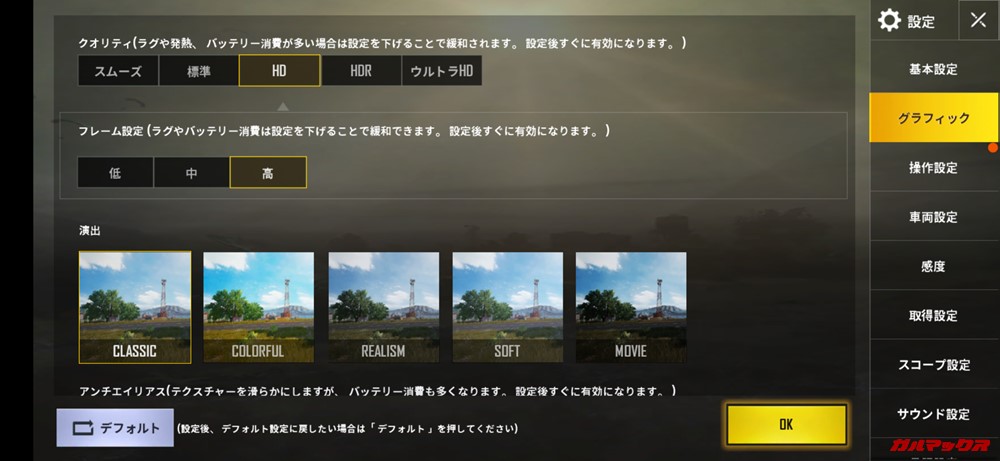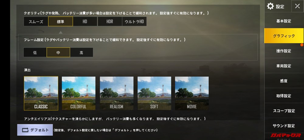 ▼Helio P70での初期設定は「標準画質」。↓