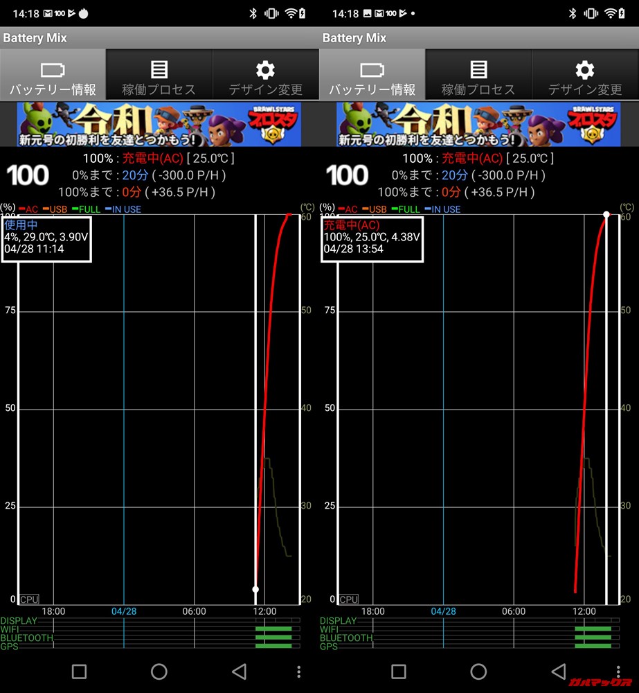 付属の充電器と充電ケーブルを利用してバッテリーが空の状態から満充電までの時間を測定しています。スマートフォンはバッテリーが切れた状態で充電を開始、起動後に測定アプリを起動するのでデータ取得開始時点で数%の誤差が出ます。この点はご了承下さい。