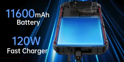 ▼本機は11600mAhのバッテリーを搭載しています。一般的なAndroid端末なら2台分、iPhoneなら3台分です。また、120Wの急速充電にも対応しているので、大容量バッテリーだからといって、充電速度の遅さに悩むことはありません。↓