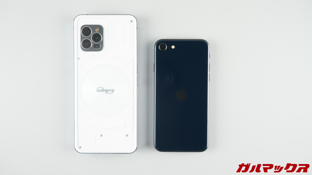 ▼サイズ比較のために片手マシンのiPhone SE(3世代)と並べてみた。明らかにデカイ。握りづらい。↓