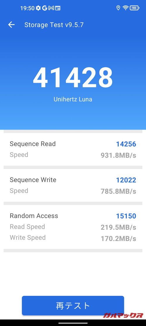 ▼ストレージ速度は読み込みが931.8MB/s、書き込みが785.8MB/s!使っていて特に不満を感じることもなく十分である。↓