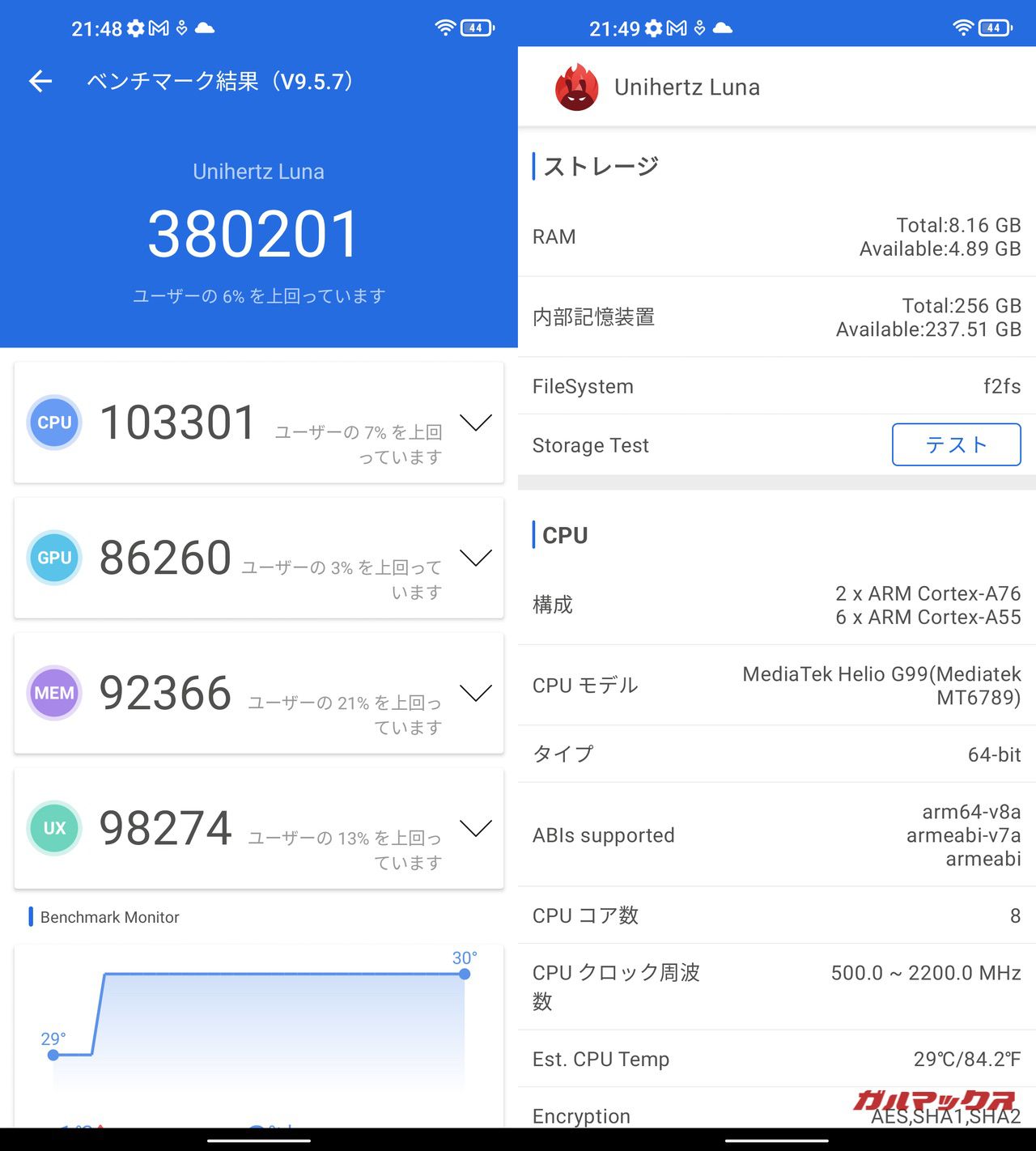 ▼Unihertz Lunaの実機AnTuTu(Ver9)スコアは総合が380,201点、GPUが86,260点!↓