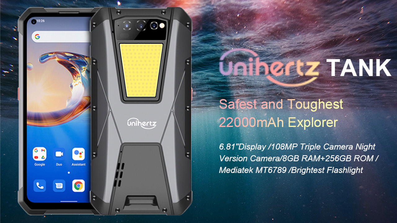 Unihertzが新型スマホ「Unihertz Tank」を発表!ミドルハイのHelio G99に1億800万画素カメラ、巨大ライトに22,000mAhバッテリーを搭載!頑丈なタフネスなのでアウトドアだけでなく災害時用のスマホとしても良さげ!