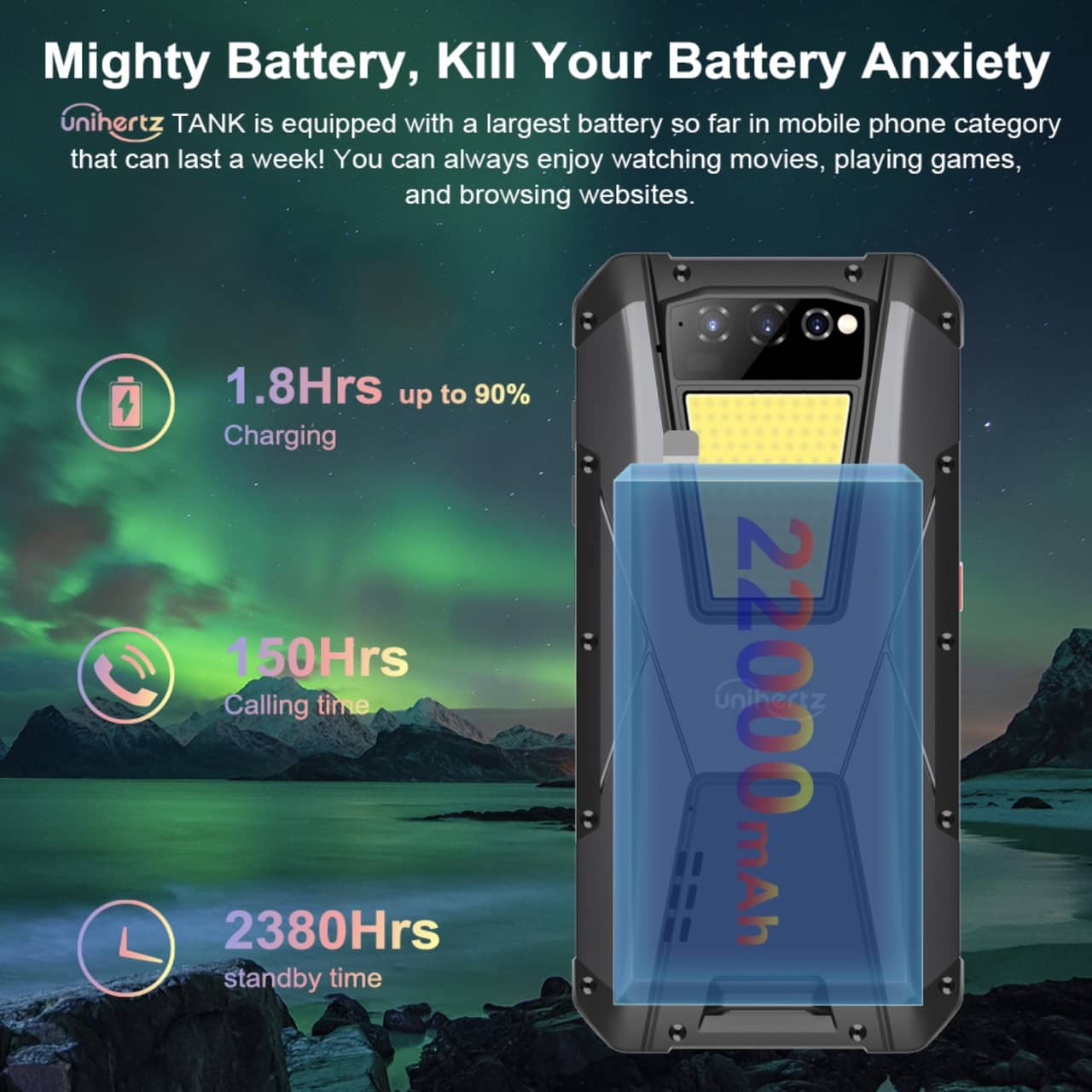 ▼なんと、Unihertz Tankは22,000mAhバッテリーも積んじゃってるんです!もはや桁違いの化け物クラスのバッテリー。↓