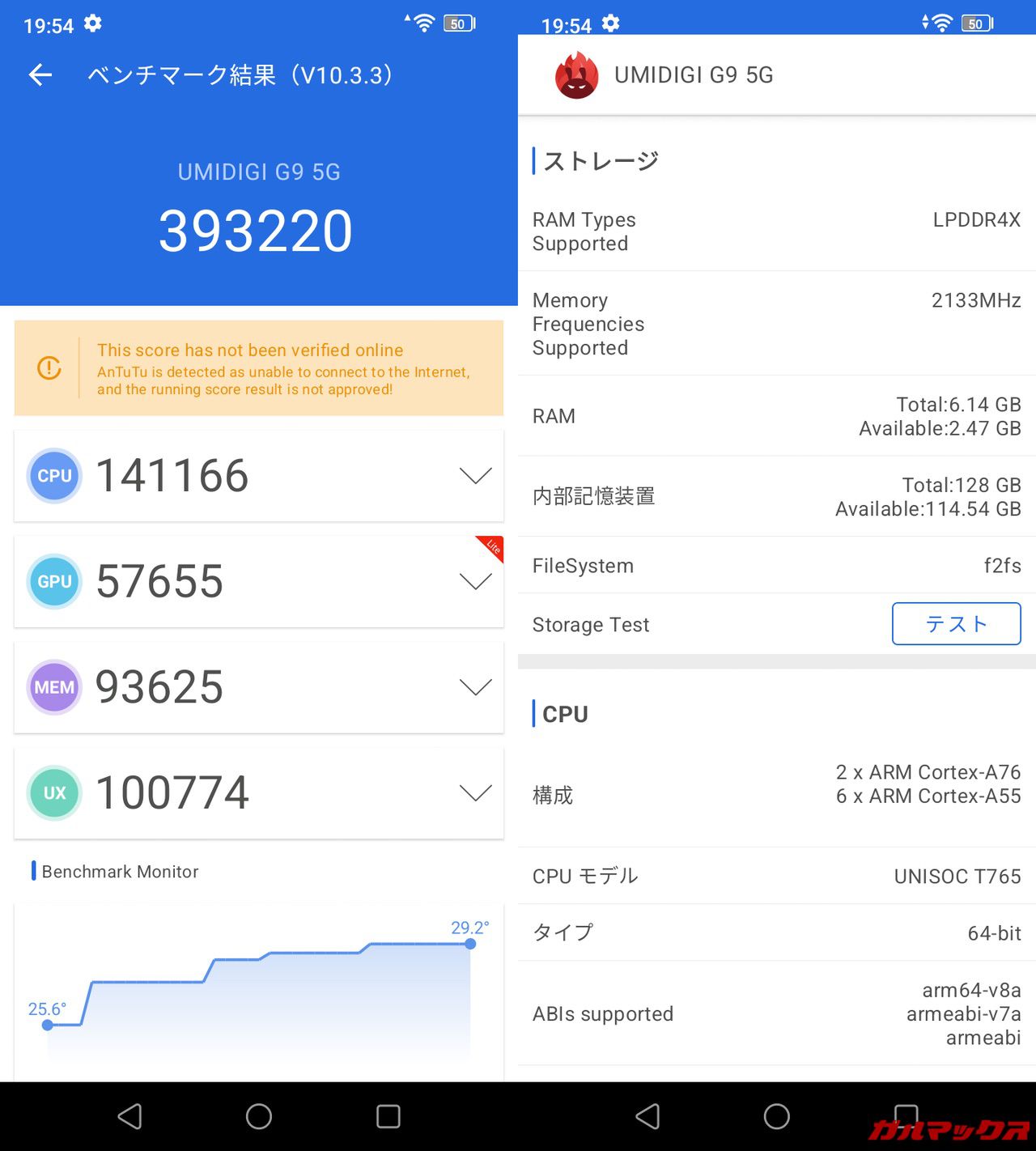 ▼Unisoc T765の実機AnTuTuのスコアは総合スコアが393,220点、GPUスコアは57,655点、UXは100,774点となっていました。↓