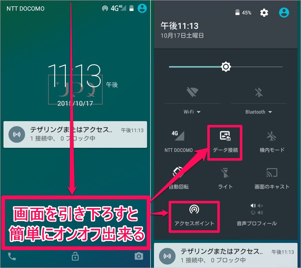 ↓ロック状態でもサクッとアクセスポイントやデータ接続のオンオフが可能で便利。