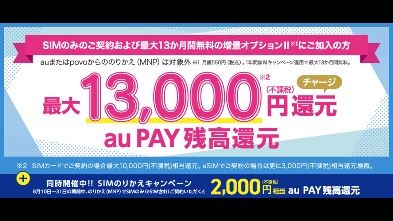 UQ Mobileで最大1.3万円還元のキャンペーン開催中!8月中のMNPで還元金額が増加するぞ!
