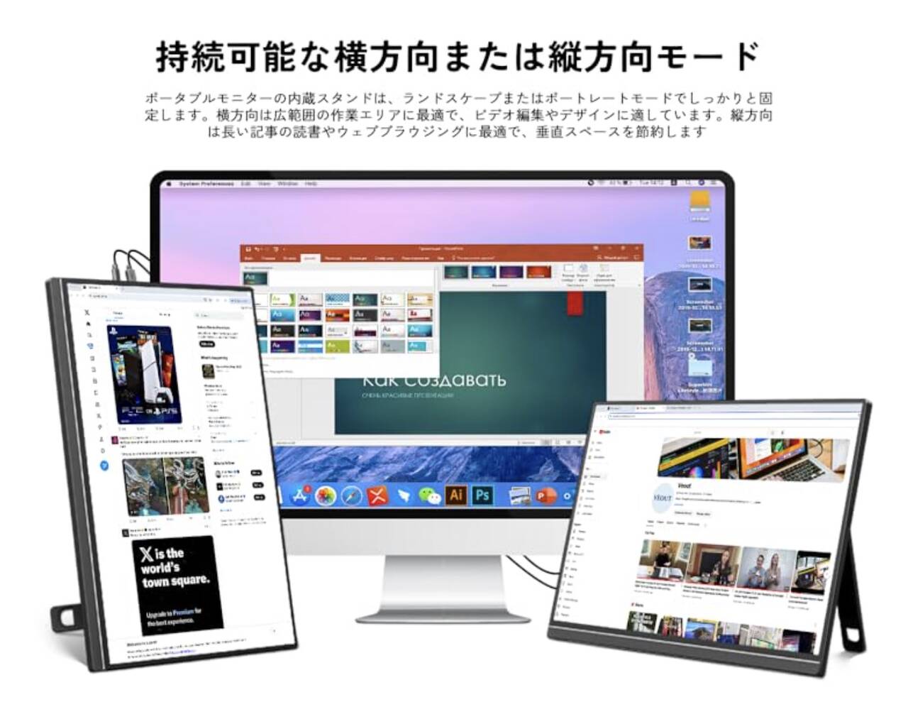 僕もモバイルモニターは使ってるんですが、横に置くと結構視点移動距離も長くなるし、WEBサイトや資料も1画面で表示できる範囲が限られているので、縦に設置出来たら良いのにってずっと思ってたんですよ。