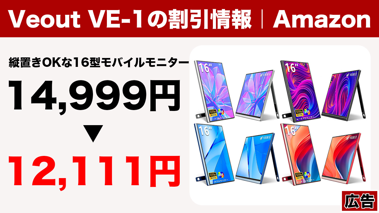 Amazonのタイムセールで16型のモバイルモニター「‎Veout VE-1」が割引中!通常価格14,999円が12,111円となっています!4月13日までの短期割引なのでお見逃し無く!