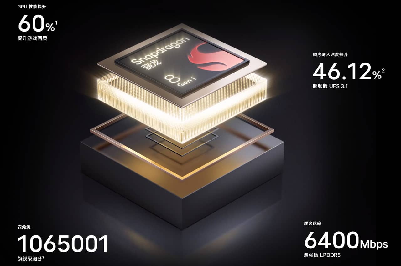 ▼SoCはハイエンドとして名高いチップセットSnapdragon 8 Gen 1を採用!公式AnTuTuスコアでは1,065,001点だそうで、ものすごくパワフル!ただ発熱が結構あるSoCでもあるので、人によって好みは分かれる部分といえるでしょう。少なくとも普段使いは快適。↓
