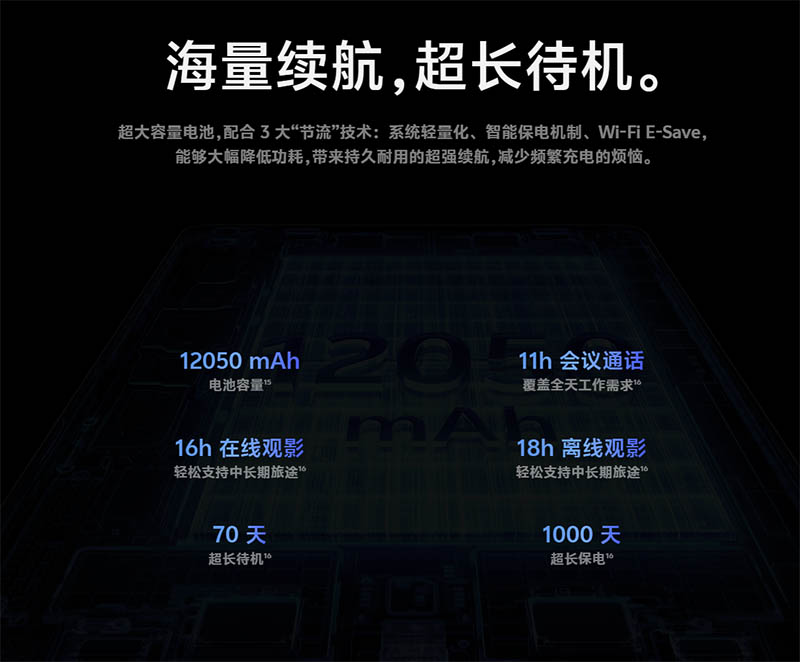 ▼バッテリー容量は12,050mAh、66W(FlashCharge)の急速充電にも対応しています。16時間の連続オンライン動画視聴が可能とのこと。↓