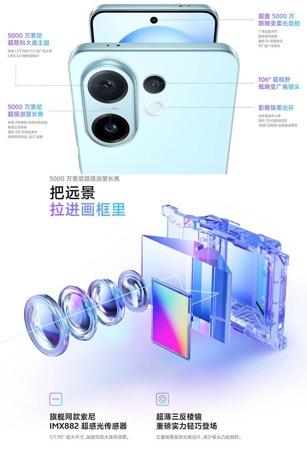 カメラは50MP(広角)+50MP(望遠)+8MP(超広角)のトリプルカメラ!望遠レンズには同社のハイエンドシリーズであるvivo X200、vivo X200 Pro Miniと同じIMX882を採用しています。100倍のデジタルズームにも対応しており、望遠、マクロ性能には期待ができます。インカメラも50MPで高画素な自撮りを楽しめます。